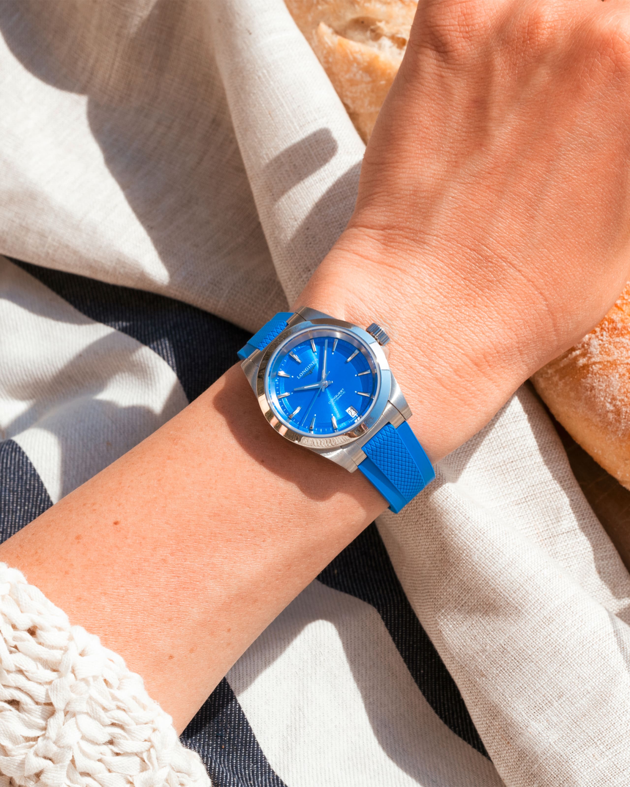 Das exklusive Kautschukarmband des Damenmodells macht die Uhr zu einem echten Hingucker: Es ist in demselben leuchtend blau wie das Zifferblatt gearbeitet. Das elegante und sportliche Design passt nicht nur zu dem Lebensgefühl der Nordseeinsel sondern ist der perfekte Begleiter für den Alltag.