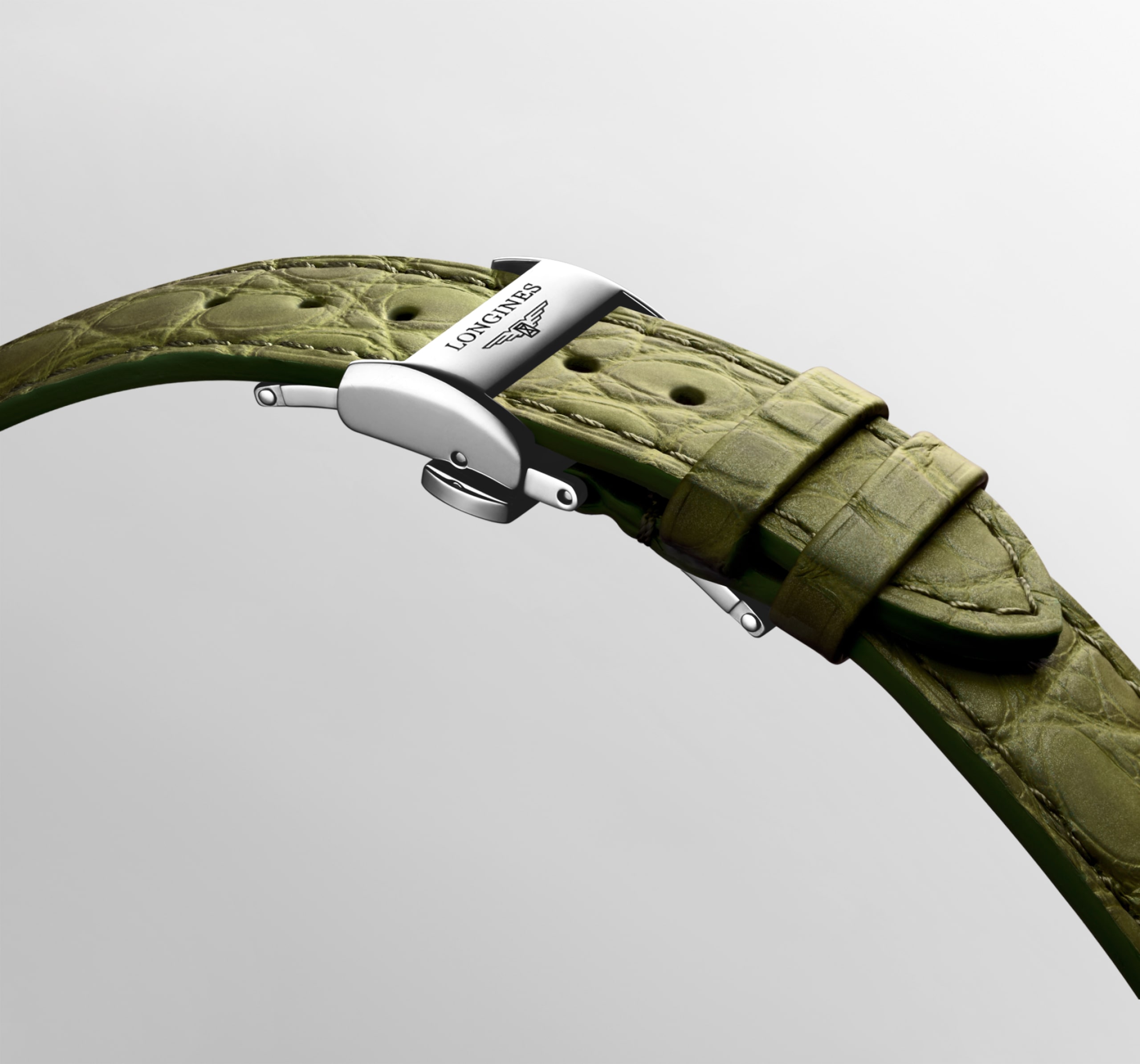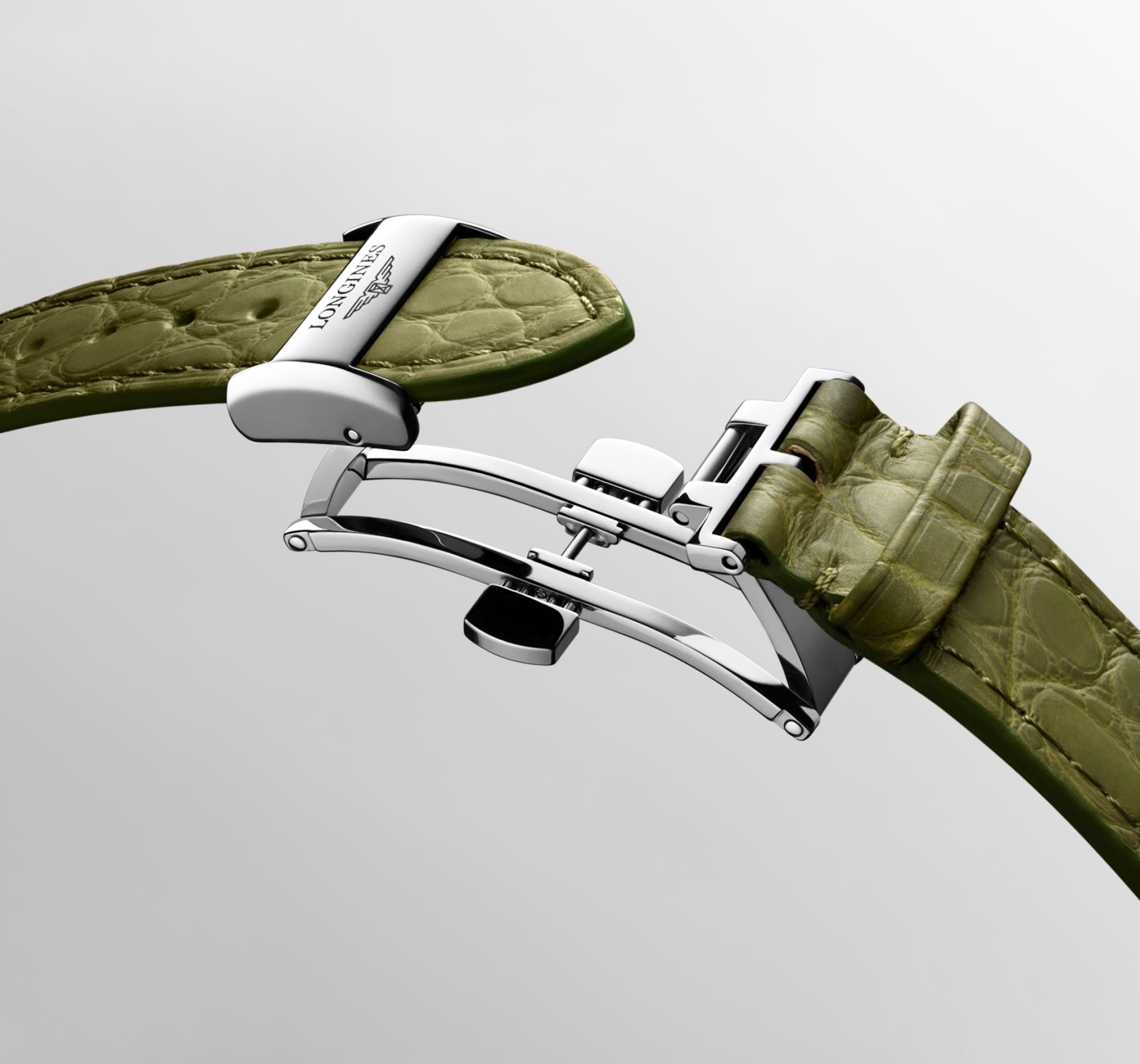 Alligator strap bracelet, with triple safety folding clasp and push-piece opening mechanism.