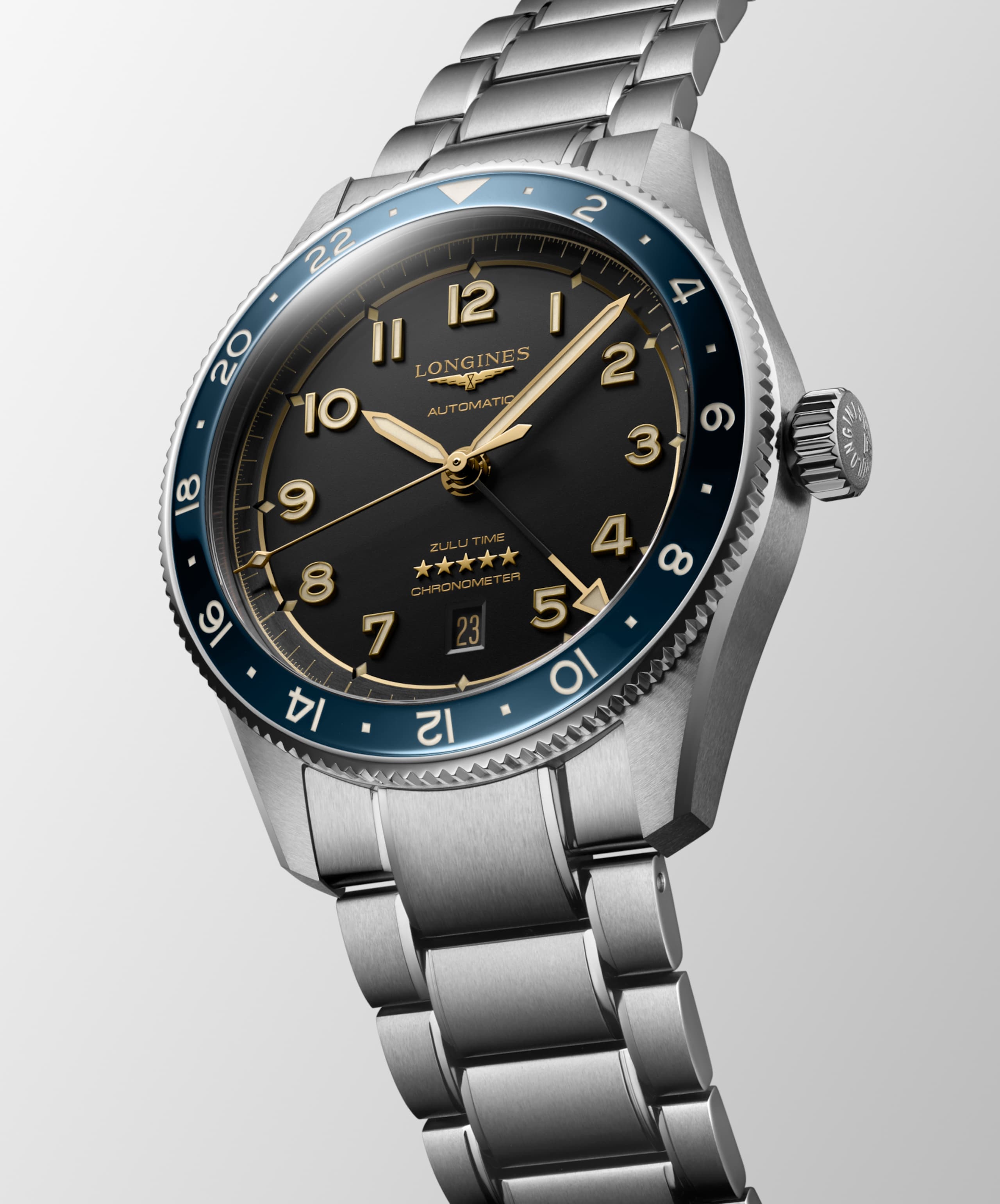 O Longines Spirit Zulu Time simboliza a mestria centenária da marca em relógios com múltiplos fusos horários. A sua origem e o seu nome provêm do primeiro relógio de pulso Longines com duplo fuso horário fabricado em 1925, que apresentava a bandeira Zulu no seu mostrador – Zulu referindo-se à letra "Z" que designa o tempo universal para os aviadores. Esteticamente, o Longines Spirit Zulu Time distingue-se pela sua execução meticulosa e pelo cuidado particular dado aos diferentes pormenores. Apresenta uma luneta rotativa bidirecional com uma inserção de cerâmica. Cada modelo é alimentado por um calibre exclusivo Longines, equipado com uma mola espiral de silício, resistente a campos magnéticos e certificado como cronómetro pelo COSC.